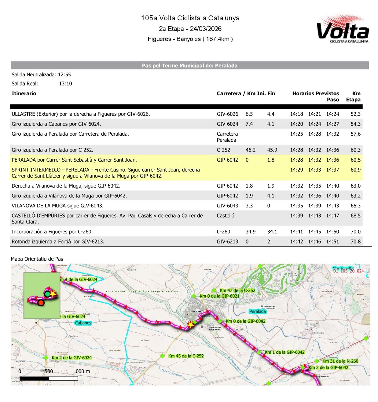 A més, Peralada serà escenari d’un esprint intermedi, situat al c/ Sant Joan, on els tres primers ciclistes que hi passin obtindran punts addicionals per a la classificació general.